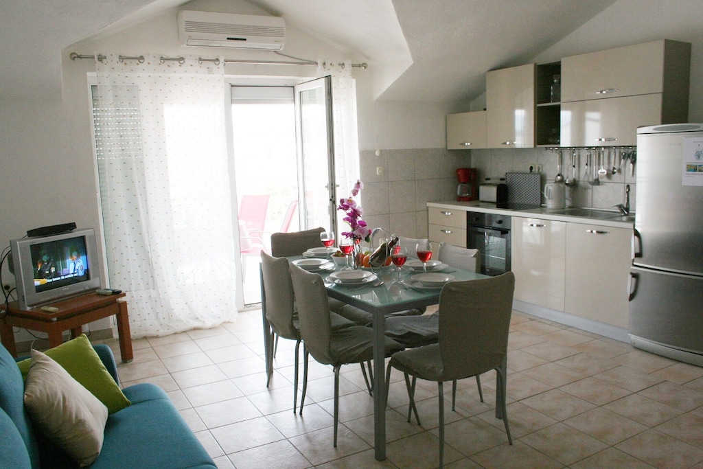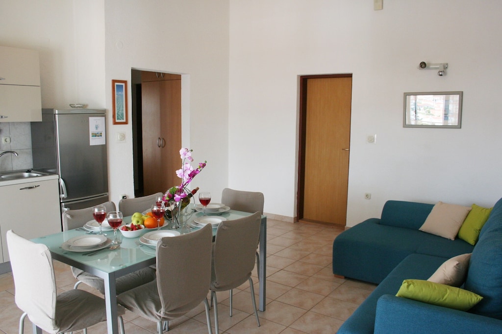 Apartmán má 3 ložnice, dvě koupelny, kuchyň a prostorný obývací pokoj. Dvě ložnice a obývací pokoj mají výhled na moře a vstup na balkon. Apartmán je plně vybaven pračkou, fénem, lůžkovinami, ručníky, mikrovlnnou troubou, troubou, sporákem, kávovarem, varnou konvicí atd. WiFi je přístupné bez poplatku.Na zahradě jsou pro vás připravena lehátka, plynový gril s jíd...